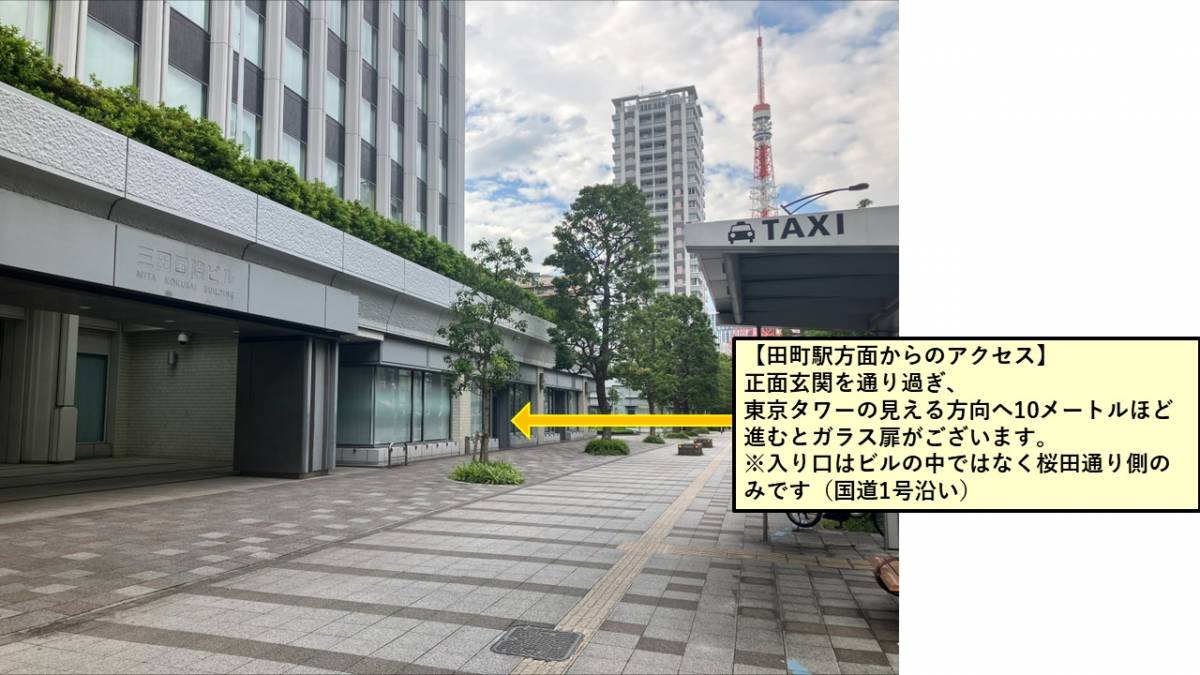 三田国際ビルの1階がガラス張りになっており、桜田通り沿いにジョブトラセミナールームの入り口がございます▼